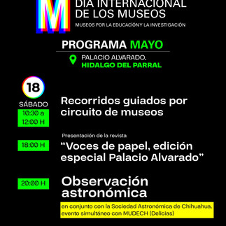En el marco del Día Internacional de los Museos (DIM), la Secretaría de Cultura del Estado de Chihuahua invita a las actividades que se realizarán el sábado 18 del mes en curso de forma gratuita en Hidalgo del Parral, como recorridos guiados en los emblemáticos recintos de la ciudad, la actividad “Observación Astronómica” y la presentación de la revista Voces de Papel, edición Palacio Alvarado.